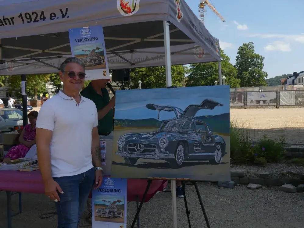 Der Hobbymaler Dietmar Dresen aus Grafschaft hatte ein Gemälde eines Mercedes-Flügeltürers gestiftet, dessen Erlös an den Hospiz-Verein Rhein-Ahr e.V. geht.