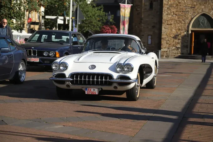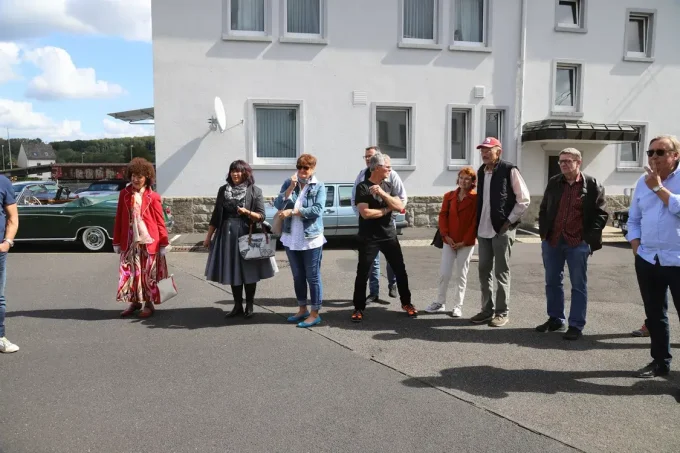 Dort angekommen gab es eine kleine Stärkung in Form von Kaffee und Kuchen. Hierfür Herzlichen Dank an Jürgen. Nach einer Führung durch die Firma, (Oldtimer Restauration, Jamlong Mode und Vintage Music) fuhren 24 Autos im Korso auf den Marktplatz von Wirges wo wir von Seiten des Bürgermeisters der Stadt Wirges empfangen wurden.