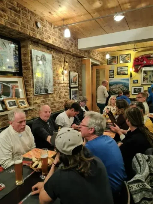 Lebhaftes Fachsimpeln rund um die Rallyeautos vom Schlag eines BMW 325i, Opel Kadett C-Coupe, Ford Escort RS, Saab 900, Audi Quattro, Austin Rover, Talbot Sunbeam, Porsche 911 oder Toyota Celica setzte sich nach der Rallye im Restaurant „Pistenklause“ im Hotel „Tiergarten“ in Nürburg fort.
