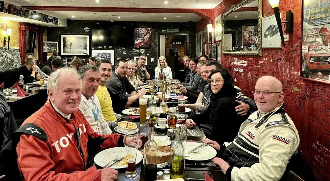 Lebhaftes Fachsimpeln rund um die Rallyeautos vom Schlag eines BMW 325i, Opel Kadett C-Coupe, Ford Escort RS, Saab 900, Audi Quattro, Austin Rover, Talbot Sunbeam, Porsche 911 oder Toyota Celica setzte sich nach der Rallye im Restaurant „Pistenklause“ im Hotel „Tiergarten“ in Nürburg fort.