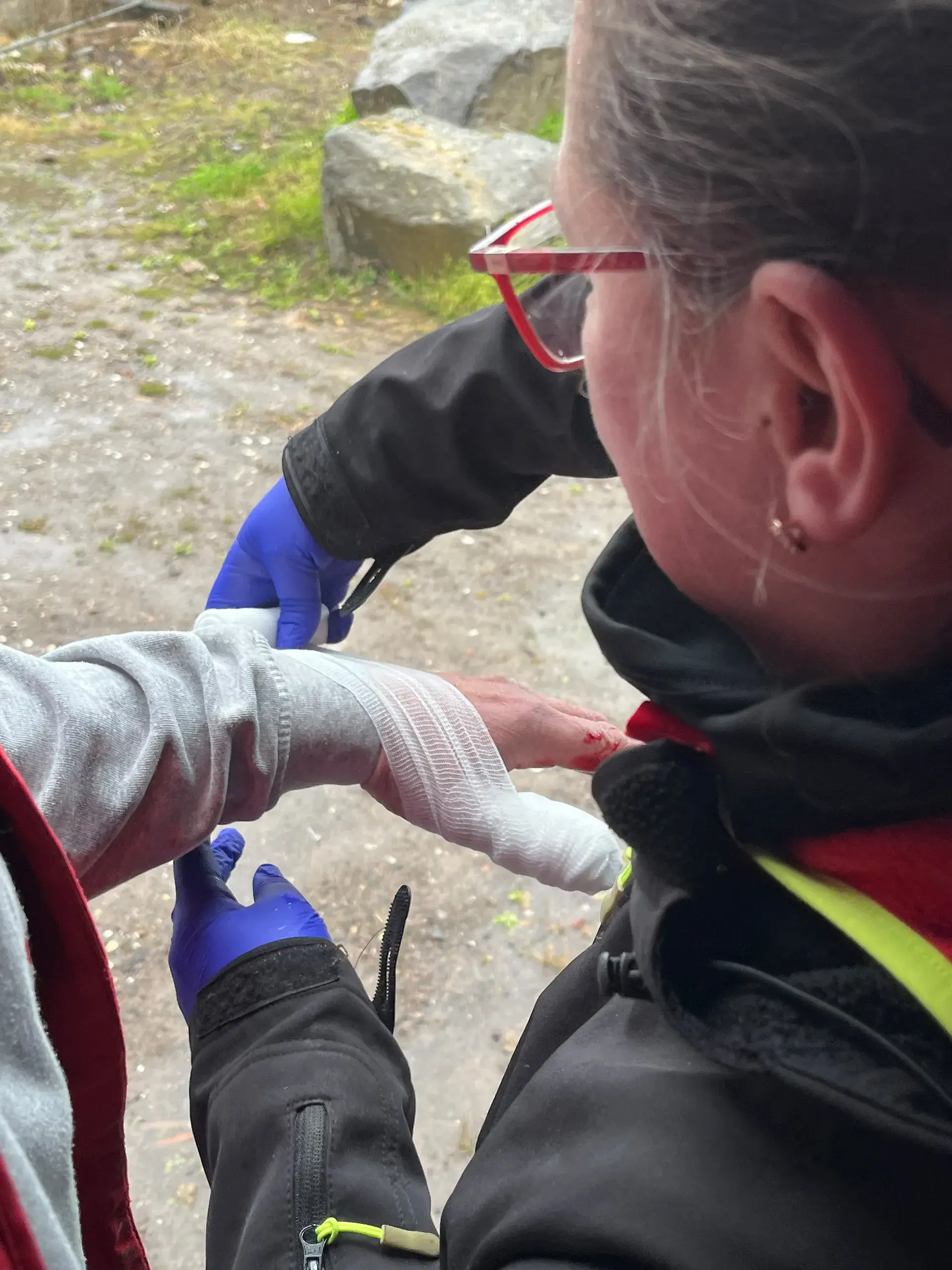 Typische Verletzungen im Trial Sport wurden besprochen und gleichzeitig praktisch geübt, wie man ersthelfend darauf reagieren kann: Stabile Seitenlage, Atemkontrolle, Helm abnehmen, Versorgung von offenen Brüchen, Stabilisieren von Knochenbrüchen und das Anlegen von Verbänden.