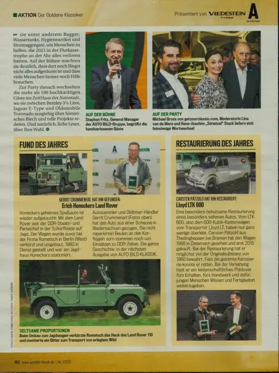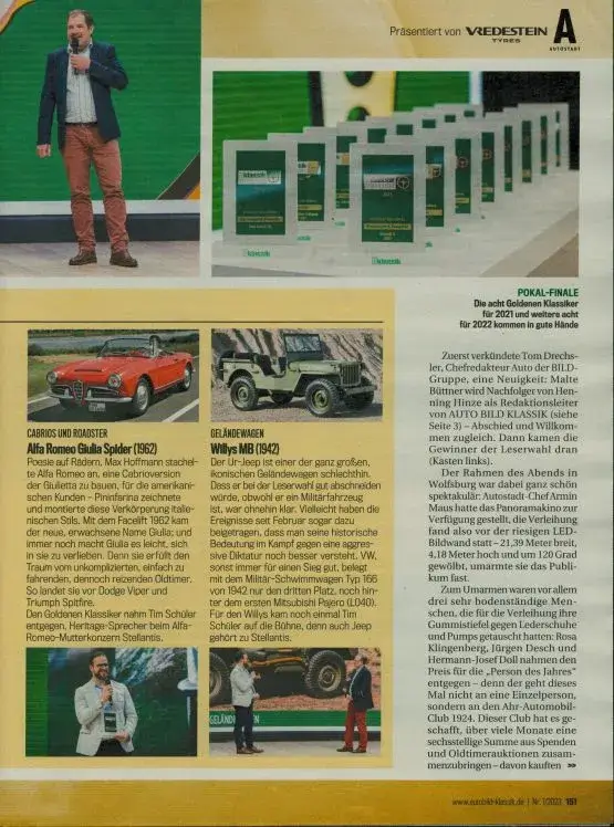 Neben den Klassikern des Jahres (gewählt von den Lesern der Auto-BILD-Klassik) wurden auch drei weitere Ehrungen vergeben: Der Fund, die Restaurierung und die Person des Jahres 2021 und 2022. Hier wurden die Sieger von der Redaktionsjury gewählt.